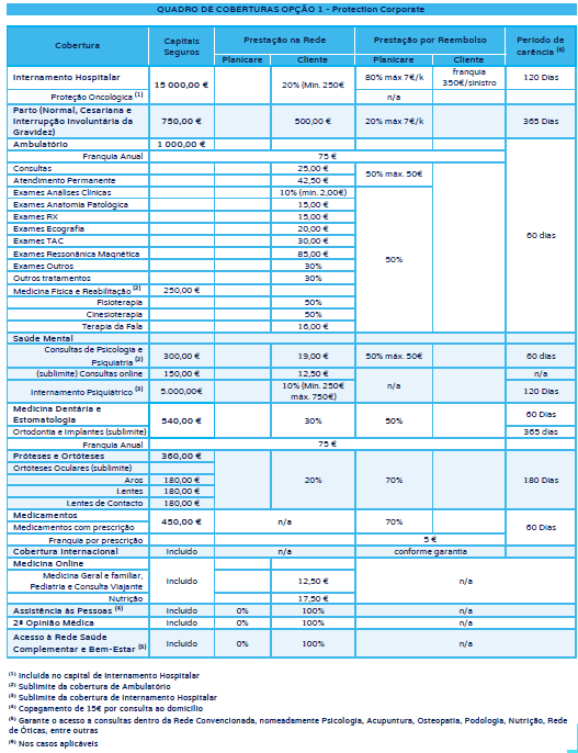 PLANICARE: o reembolso de despesas apresentadas previamente à ADSE ou outro sistema, aplica-se o valor de comparticipação previsto da coluna de “Prestações por Reembolso”.